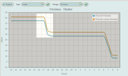 As you can see below, its possible to include several values in the same graph. In this example the graph is showing the values of the position of a Venetian blind with their slats for the last month (4 weeks) and for the last 24 hours. The values shown are the average values between hours or days, depending of the range being displayed.